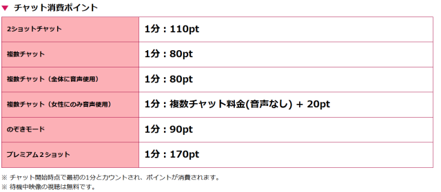 2ショットチャットが1分55円になったり、半額タイムサービスなどがあるので、新規会員登録でもらったポイントだけでもかなりコスパ良くチャットを楽しむことができます。