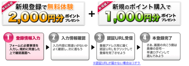 新規のポイント購入をするとさらに1,000分のポイントがもらえるので、合計3,000円分のポイントをゲットすることができます!