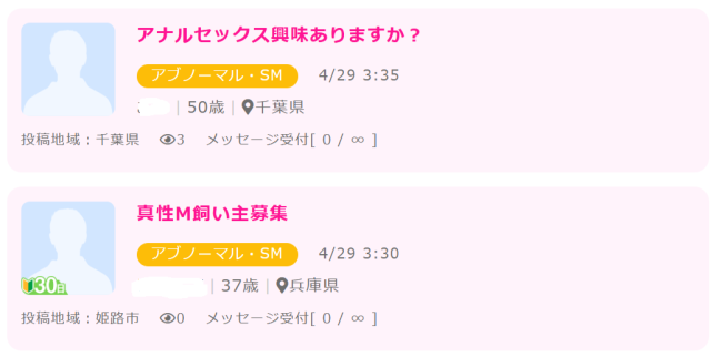 PCMAXの掲示板は、毎日3万件以上の書き込みがあり、「アブノーマル・SM」というカテゴリもあるため、そこだけを狙って検索すれば、かなりの確率でSM志向の女性とマッチできます。