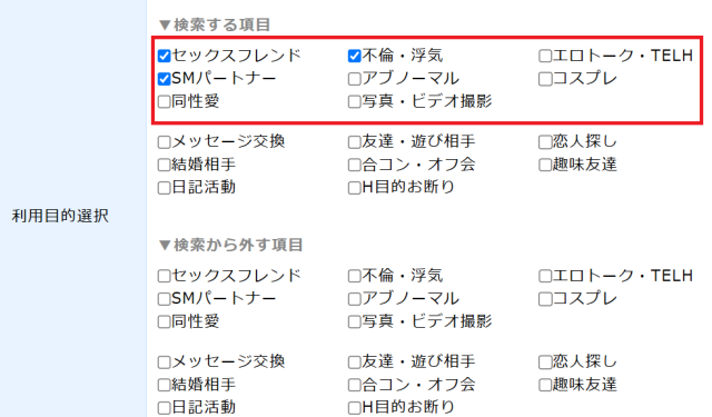 「セックスフレンド」「SMパートナー」「アブノーマル」という項目が用意されています。